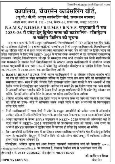 For Admission in AYUSH Under Graduate Courses viz. BAMS, BHMS BUMS & BNYS through NEET-2025 and AYUSH PG Courses (M.D./M.S.) (Ayurved) & M.D. (Homoeopathy) in AYUSH educational institutions in Rajasthan on state quota seats and NRI seats for the Session 2025-26, a State level Counseling Board has been constituted by the Government of Rajasthan under the Chairmanship of Dr. Batti Lal Bairwa, Additional Director, Department of Ayurveda, Govt of Rajasthan, Wide Order No. प. 25 (7) आयु./ 2023-1291 dated 26 July 2024.